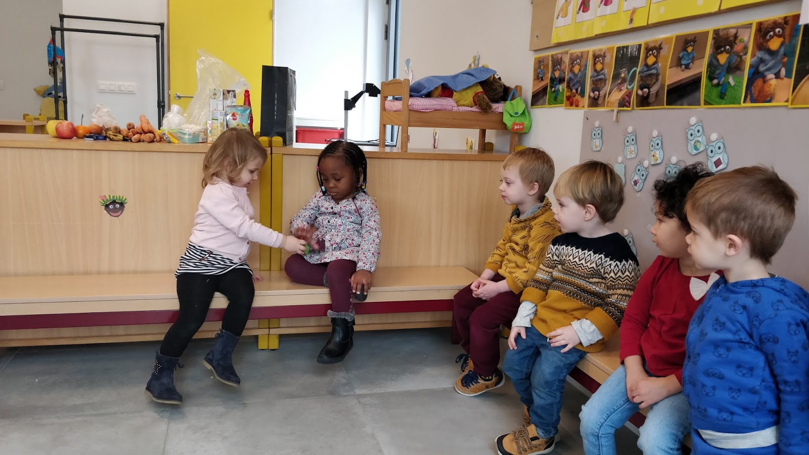 We geven rustig een pakje door en bekijken de prenten van Sinterklaas en vergeleken ze met Jezus, de Kindervriend